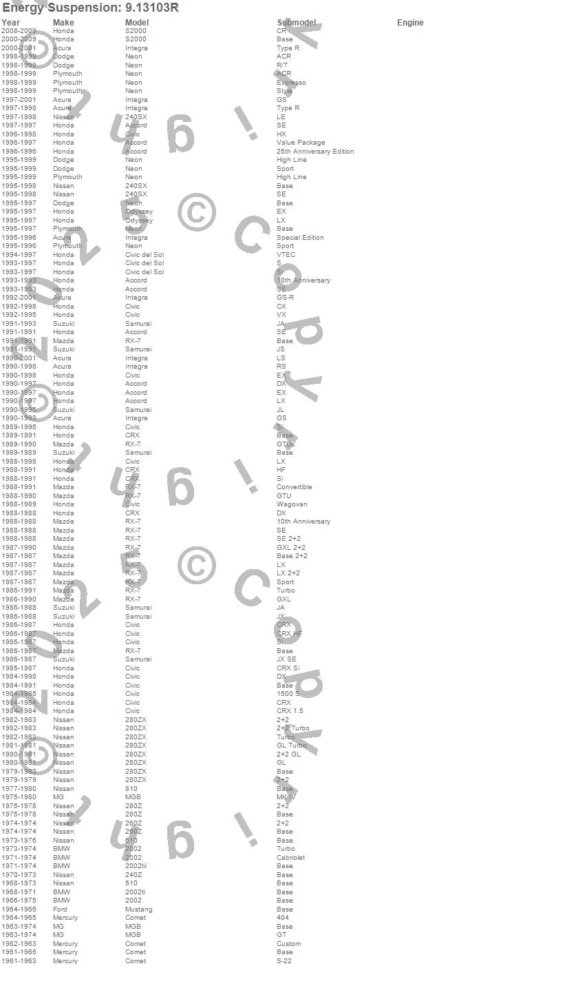 2002, 2002ti, 2002tii, 240SX, 240Z, 260Z, 280Z, 280ZX, 510, 610, 810, Accord, Civic, Civic del Sol, Comet, CRX, Integra, MGB, Mustang, Neon more…