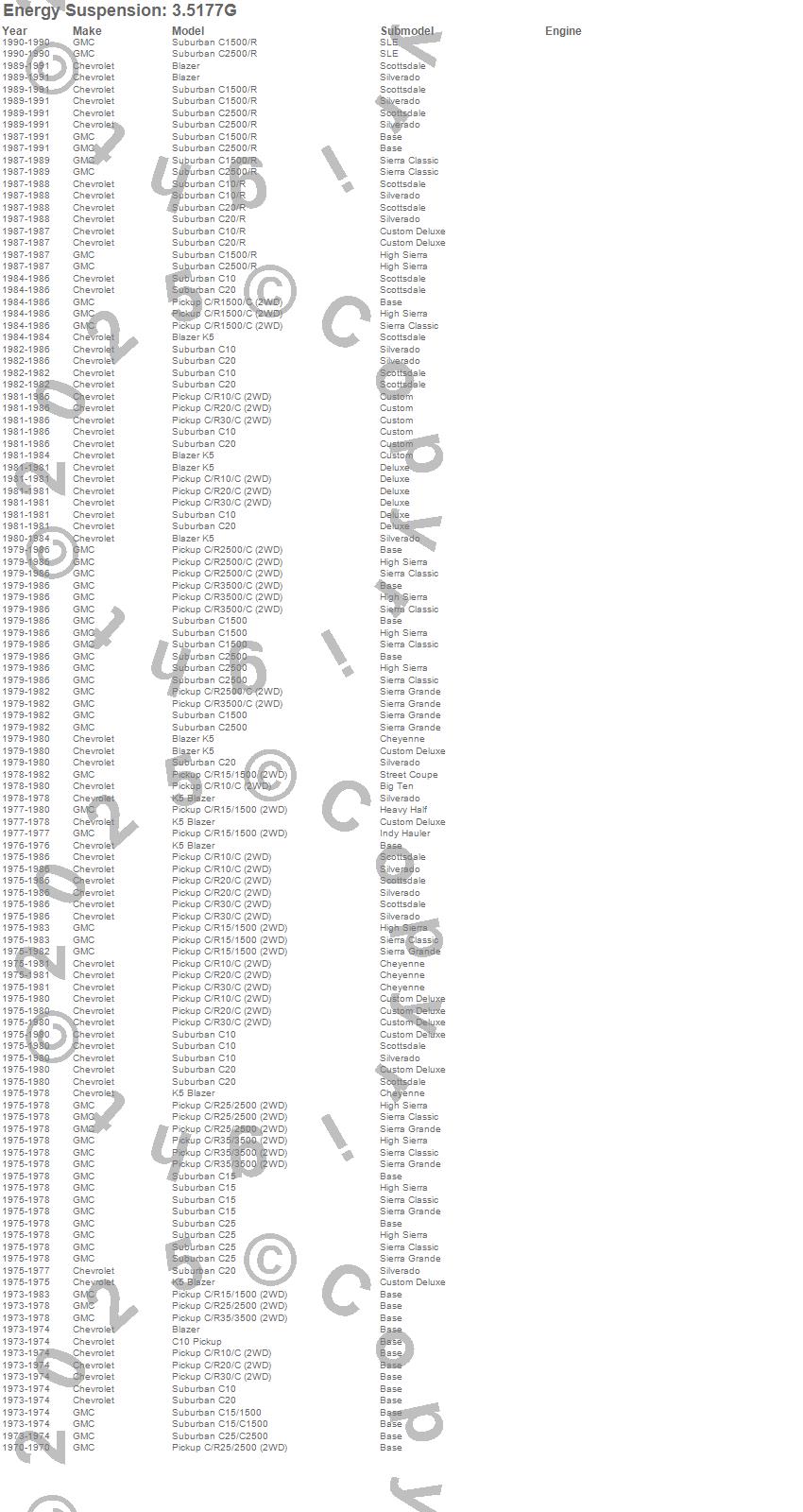 Blazer, Blazer K5, C10 Pickup, C10 Suburban, C15 Suburban, C15/C1500, C15/C1500 Suburban, C1500, C1500 Suburban, C20 Pickup, C20 Suburban, C25 Suburban, C25/C2500 Pickup, C25/C2500 Suburban, C2500 Pickup, C2500 Suburban, C30 Pickup, C35/C3500 Pickup, C3500 Pickup, R10 Suburban more…