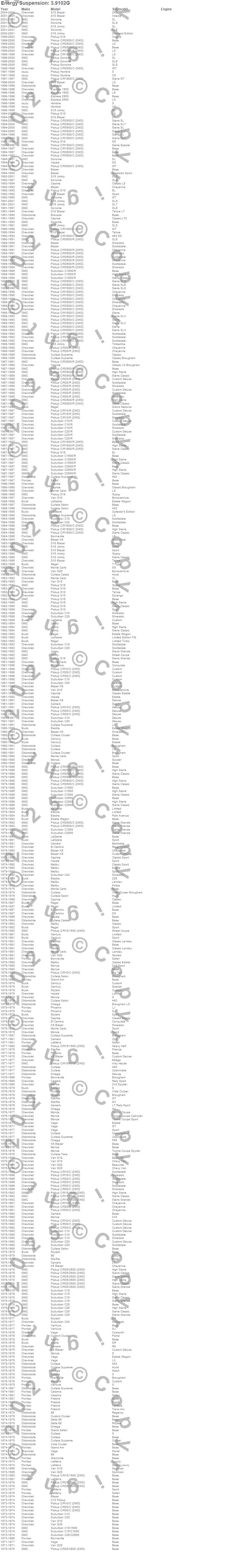 98, Apollo, Blazer, Blazer K5, Bonneville, Bravada, C10 Pickup, C10 Suburban, C15 Suburban, C15/C1500, C15/C1500 Suburban, C1500, C1500 Pickup, C1500 Suburban, C20 Pickup, C20 Suburban, C25 Suburban, C25/C2500 Pickup, C25/C2500 Suburban, C2500 Pickup more…