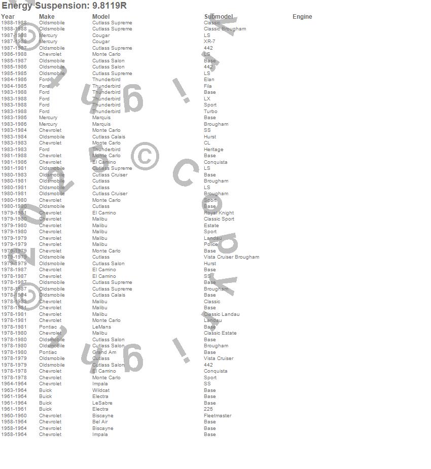 Bel Air, Biscayne, Cougar, Cutlass, Cutlass Calais, Cutlass Cruiser, Cutlass Salon, Cutlass Supreme, El Camino, Electra, Grand Am, Impala, LeMans, LeSabre, Malibu, Marquis, Monte Carlo, Thunderbird, Wildcat, Buick more…