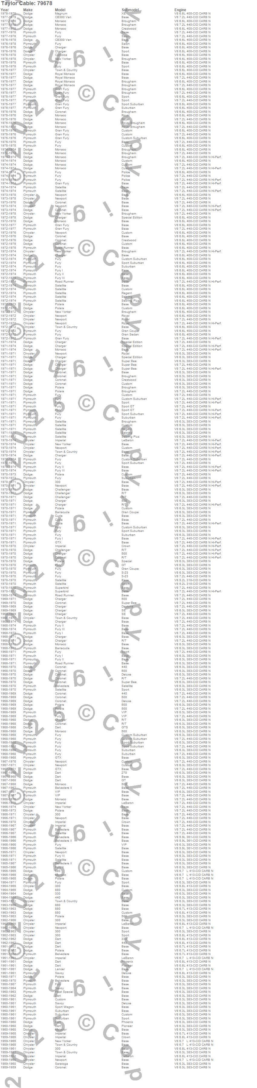 300, 330, 440, 880, Barracuda, Belvedere, Belvedere II, CB300 Van, Challenger, Charger, Cordoba, Coronet, Cuda, Custom, Dart, Fleet Special, Fury, Fury I, Fury II, Fury III more…