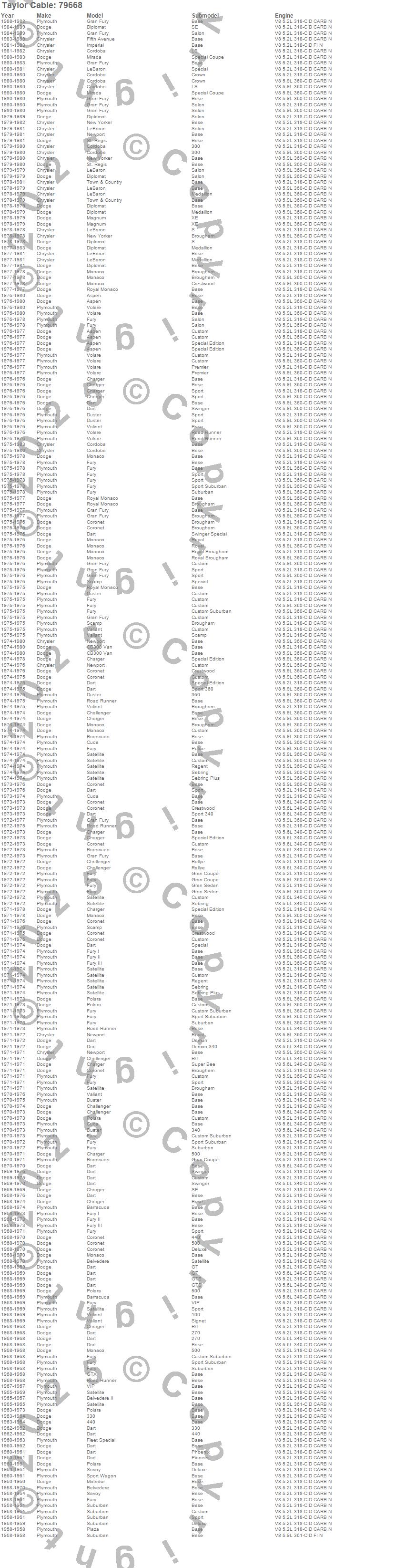 330, 440, 880, Aspen, Barracuda, Belvedere, Belvedere II, CB300 Van, Challenger, Charger, Cordoba, Coronet, Cuda, Custom, Dart, Diplomat, Duster, Fifth Avenue, Fleet Special, Fury more…