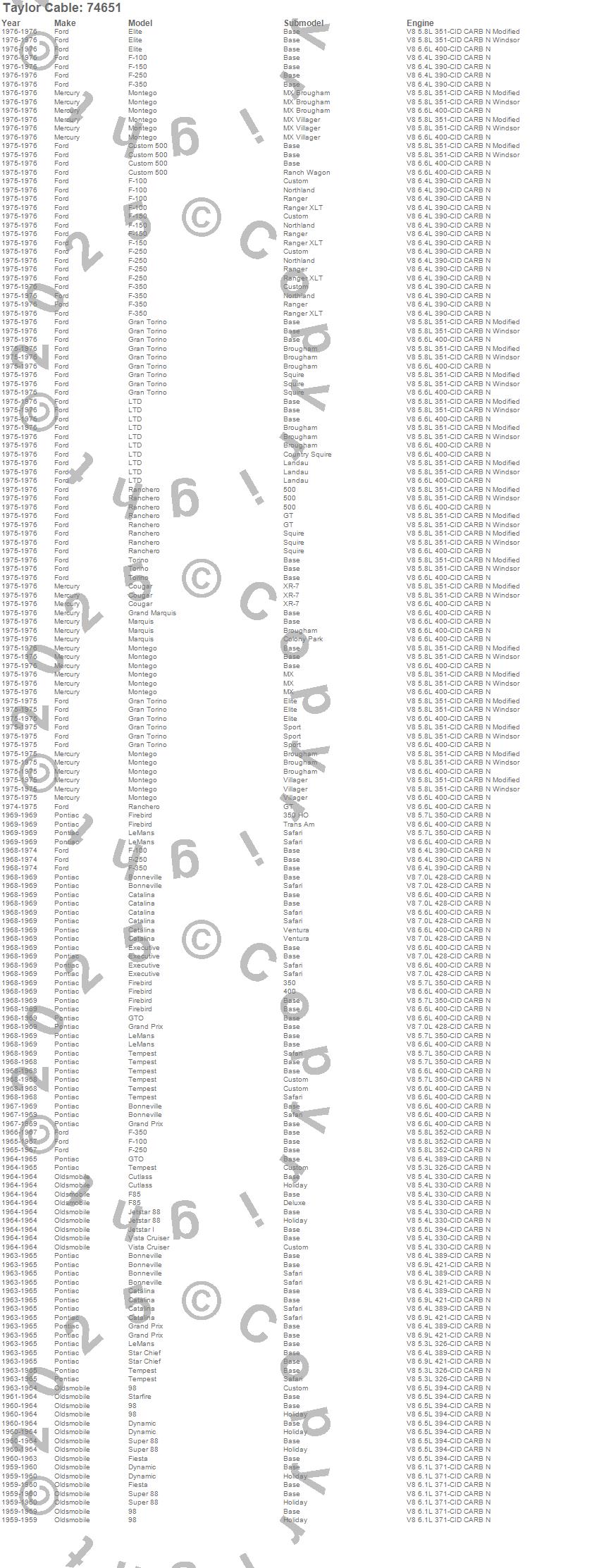 98, Bonneville, Catalina, Catalina Ventura, Cougar, Custom 500, Cutlass, Dynamic, Elite, Executive, F-100, F-150, F-250, F-350, F85, Fiesta, Firebird, Gran Torino, Grand Marquis, Grand Prix more…