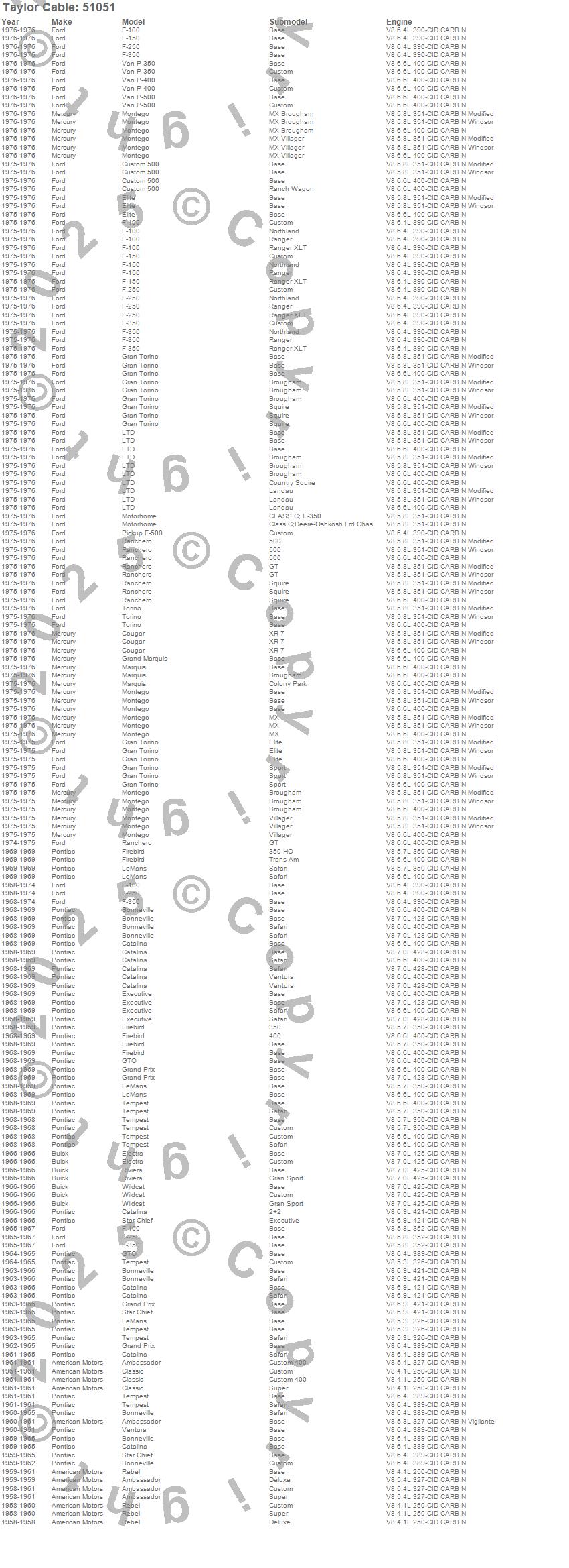 Ambassador, Bonneville, Catalina, Catalina Ventura, Classic, Cougar, Custom 500, Electra, Elite, Executive, F-100, F-150, F-250, F-350, F-500 Pickup, Firebird, Gran Torino, Grand Marquis, Grand Prix, GTO more…
