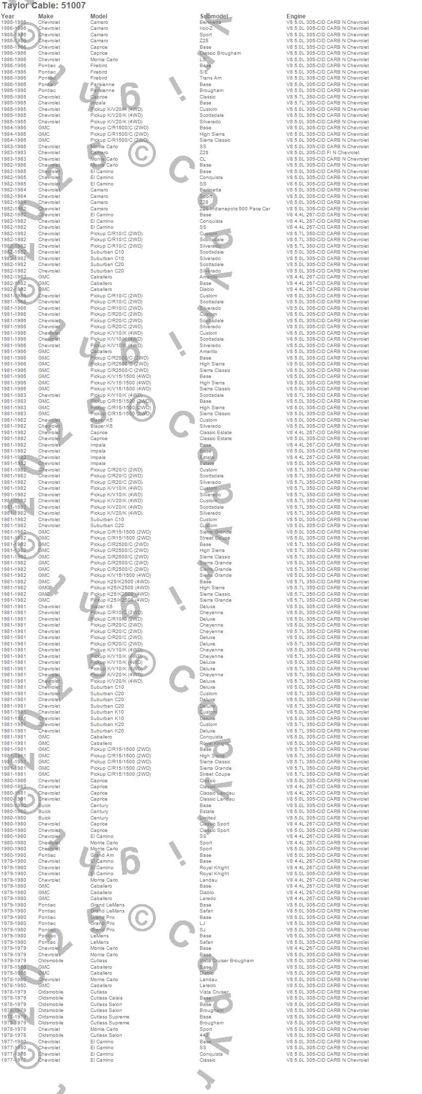 Blazer K5, C10 Pickup, C10 Suburban, C15/C1500, C1500, C20 Pickup, C20 Suburban, C2500 Pickup, Caballero, Camaro, Caprice, Century, Cutlass, Cutlass Calais, Cutlass Salon, Cutlass Supreme, El Camino, Firebird, Grand Am, Grand LeMans more…
