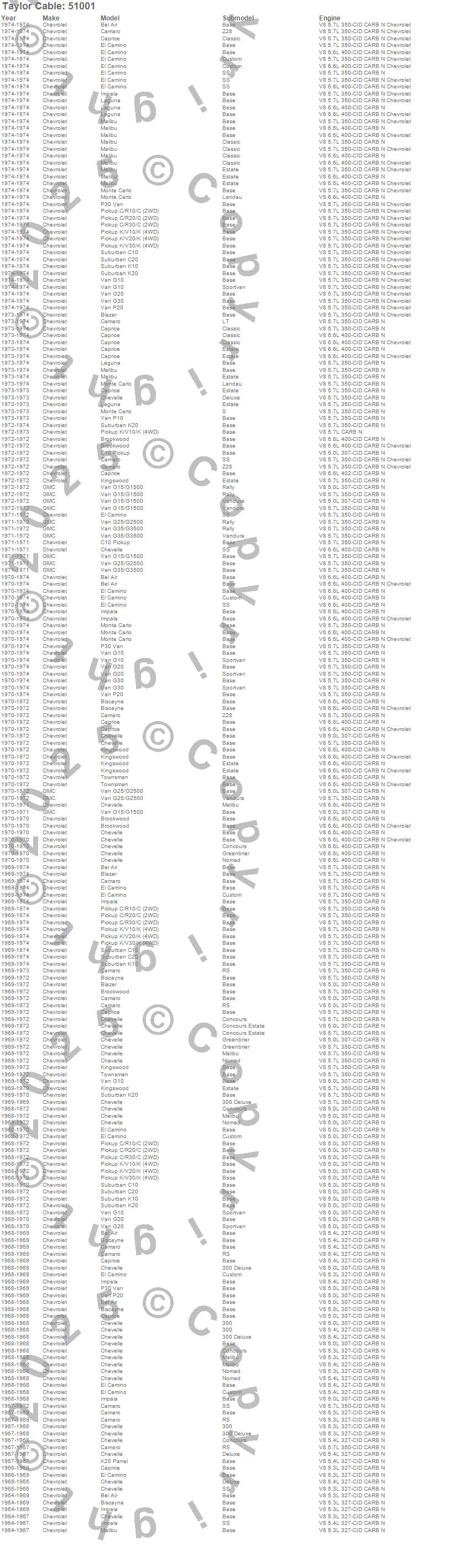 Bel Air, Biscayne, Blazer, Brookwood, C10 Pickup, C10 Suburban, C20 Pickup, C20 Suburban, C30 Pickup, Camaro, Caprice, Chevelle, El Camino, G10 Van, G15/G1500 Van, G20 Van, G25/G2500 Van, G30 Van, G35/G3500 Van, Impala more…