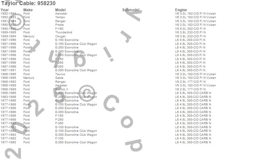 Aerostar, Bronco II, Cougar, E-100 Econoline, E-150 Econoline, E-150 Econoline Club Wagon, E-250 Econoline, E-250 Econoline Club Wagon, E-350 Econoline, E-350 Econoline Club Wagon, F-100, F-150, F-250, F-350, Probe, Ranger, Sable, Taurus, Tempo, Thunderbird more…