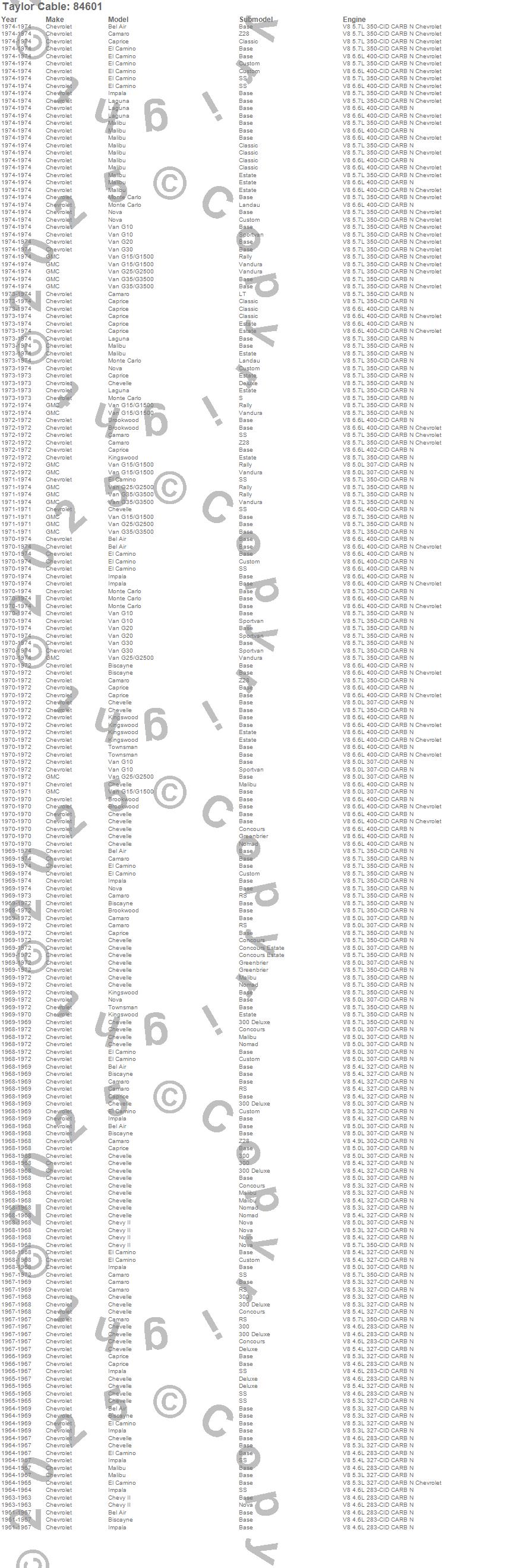 Bel Air, Biscayne, Brookwood, Camaro, Caprice, Chevelle, Chevy II, El Camino, G10 Van, G15/G1500 Van, G20 Van, G25/G2500 Van, G30 Van, G35/G3500 Van, Impala, Kingswood, Laguna, Malibu, Monte Carlo, Nova more…