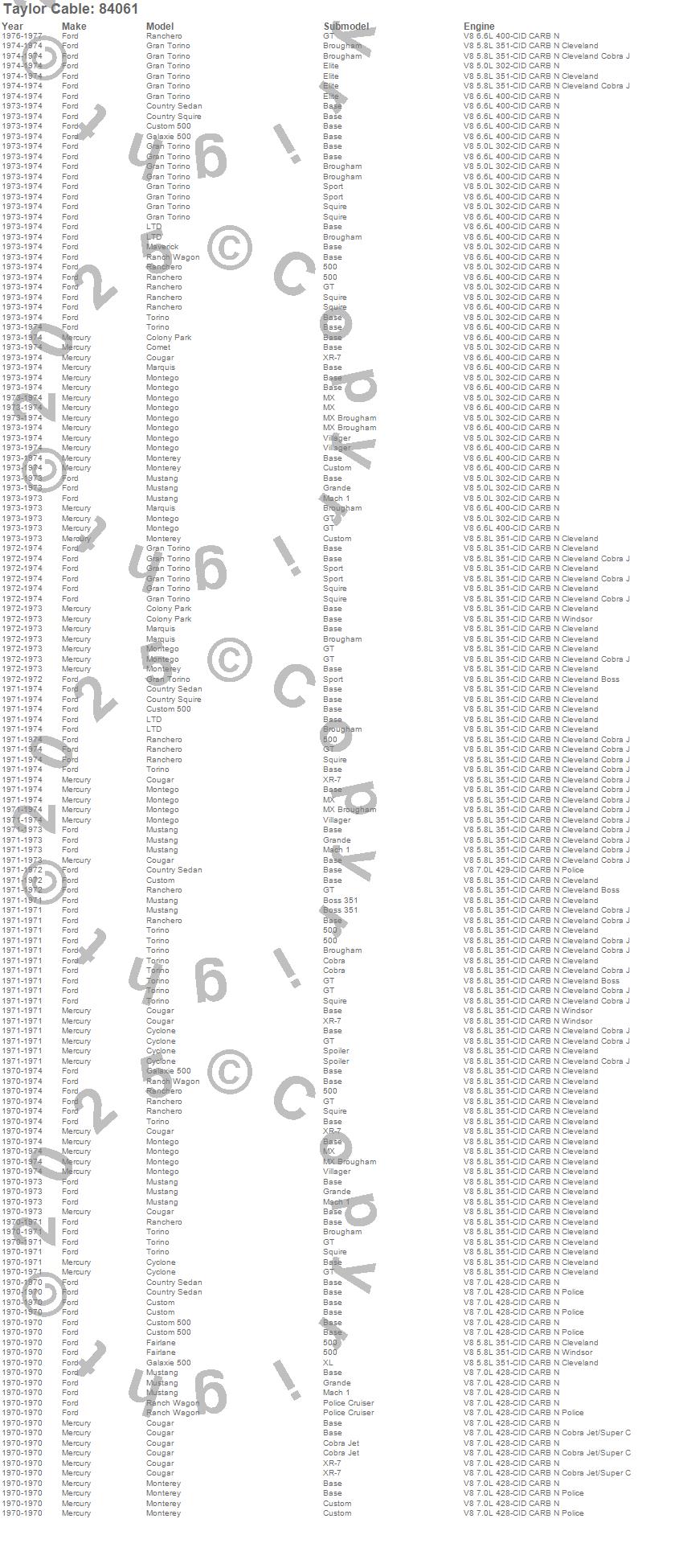 Colony Park, Comet, Cougar, Country Sedan, Country Squire, Custom, Custom 500, Cyclone, Fairlane, Galaxie 500, Gran Torino, LTD, Marquis, Maverick, Montego, Monterey, Mustang, Ranch Wagon, Ranchero, Torino more…
