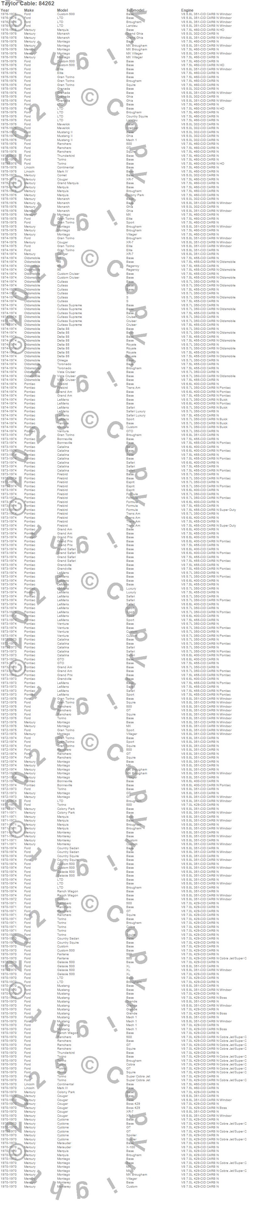 98, Bonneville, Catalina, Colony Park, Comet, Continental, Cougar, Country Sedan, Country Squire, Custom, Custom 500, Custom Cruiser, Cutlass, Cutlass Supreme, Cyclone, Delta 88, Elite, Fairlane, Firebird, Firebird Trans Am more…