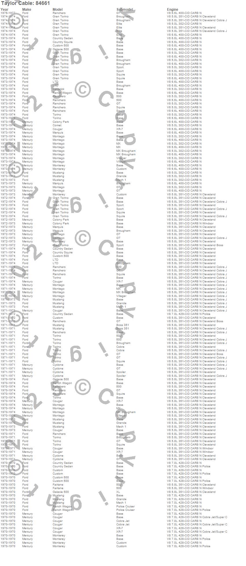 Colony Park, Comet, Cougar, Country Sedan, Country Squire, Custom, Custom 500, Cyclone, Fairlane, Galaxie 500, Gran Torino, LTD, Marquis, Maverick, Montego, Monterey, Mustang, Ranch Wagon, Ranchero, Torino more…