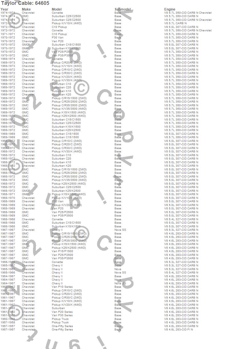 C10 Pickup, C10 Suburban, C15/C1500, C15/C1500 Suburban, C20 Pickup, C20 Suburban, C25/C2500 Pickup, C25/C2500 Suburban, C30 Pickup, C35/C3500 Pickup, Chevy II, Corvette, K10 Pickup, K10 Suburban, K15/K1500, K15/K1500 Suburban, K20 Pickup, K20 Suburban, K25/K2500 Pickup, K25/K2500 Suburban more…