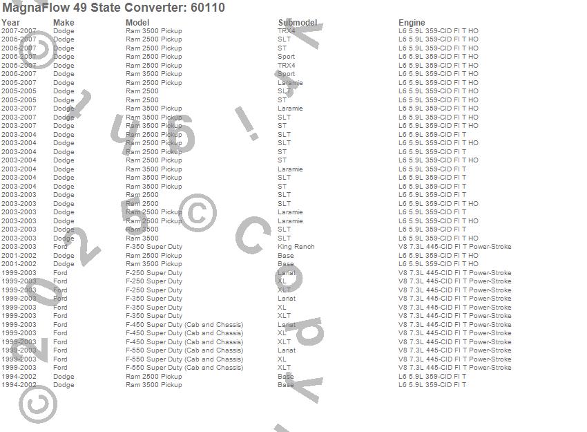 Below is an abreviated list of applications for the Universal Diesel Catalytic Converter.