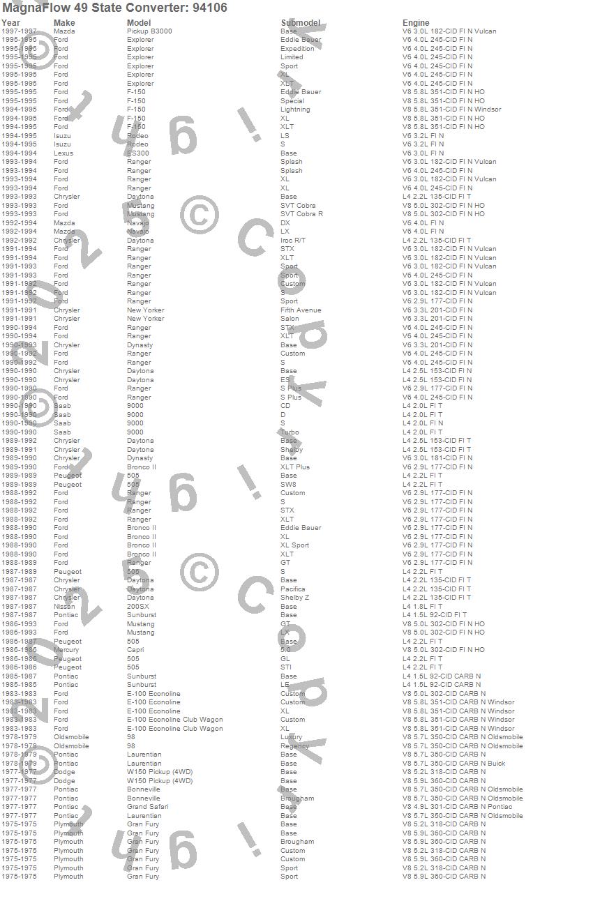 Below is an abreviated list of applications for the 94100 Series OBDII Compliant Universal Catalytic Converter.