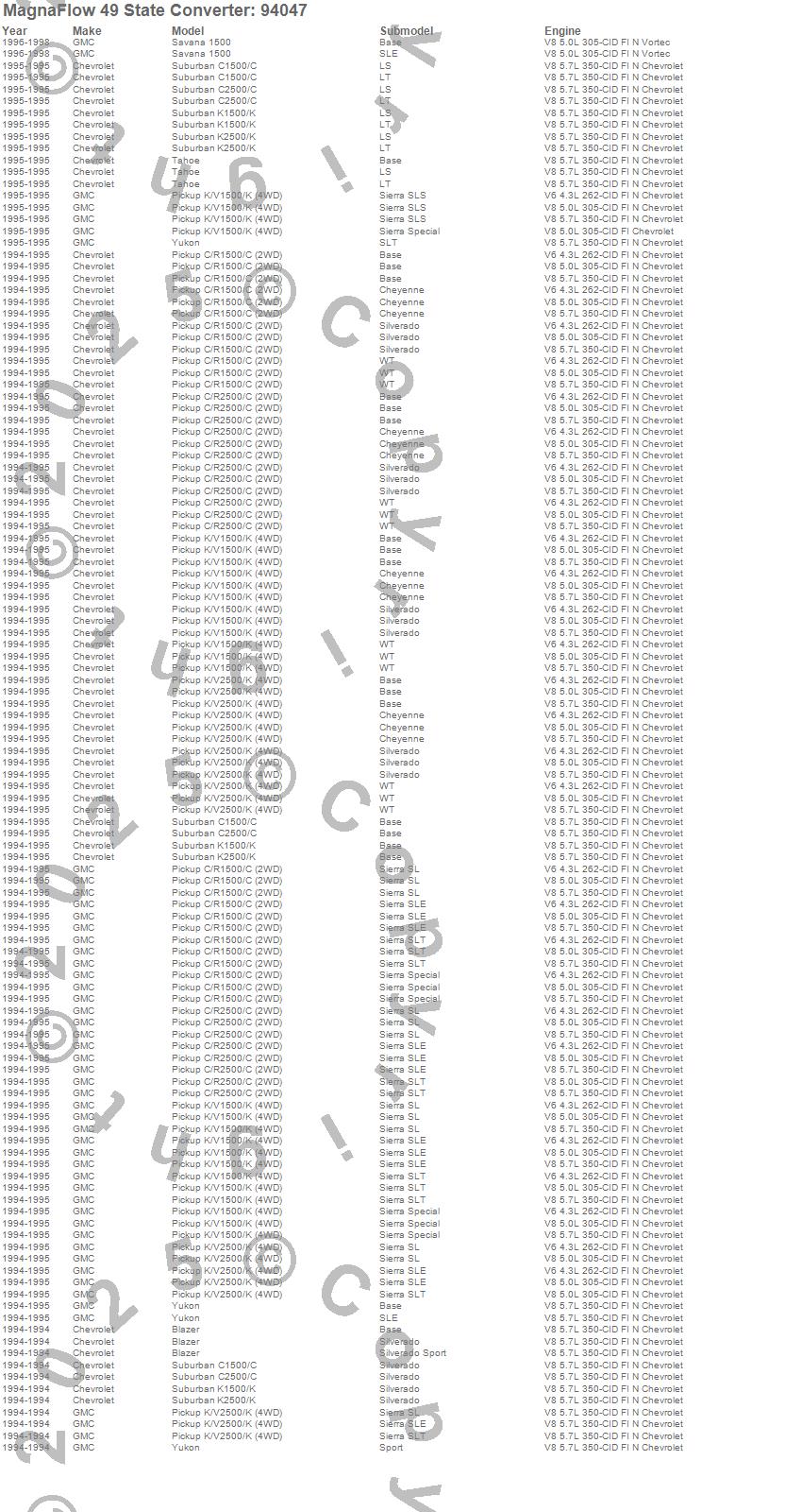 Below is an abreviated list of applications for the 94000 Series Single Sensor OBDII Compliant Universal Catalytic Converter.