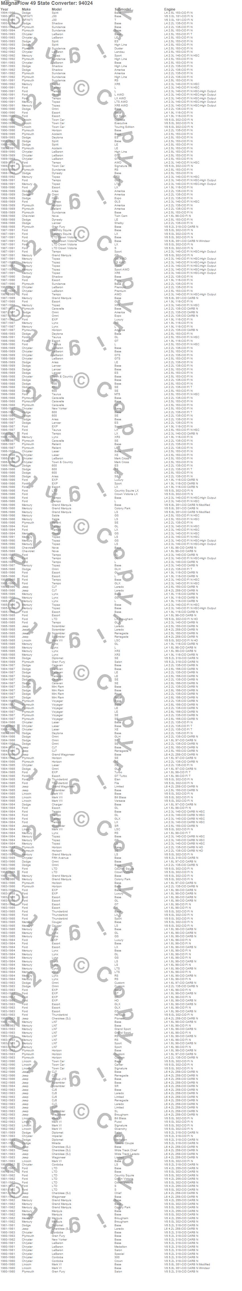 Below is an abreviated list of applications for the 94000 Series Dual Air Tube Non-OBDII Universal Catalytic Converter.
