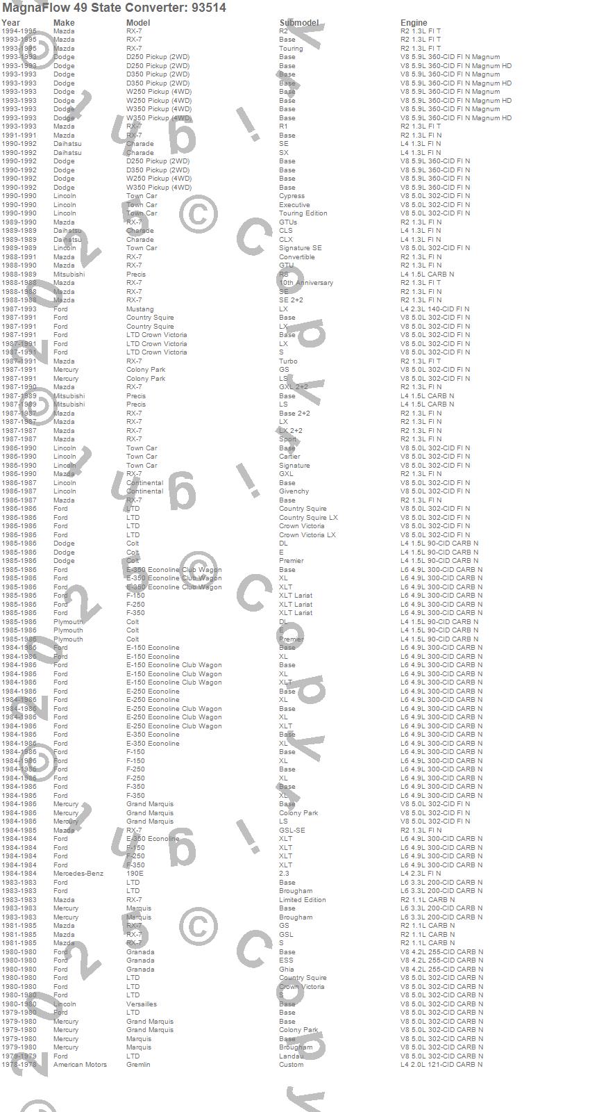 Charade, Colony Park, Colt, Continental, Country Squire, D250 Pickup, D350 Pickup, Excel, Granada, Grand Marquis, Gremlin, LTD, LTD Crown Victoria, Marquis, Mustang, Precis, RX-7, Town Car, Versailles, W250 Pickup more...