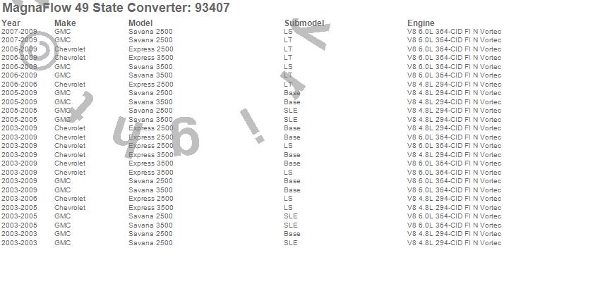 Below is an abreviated list of applications for the 93000 Series Direct Fit Catalytic Converter.