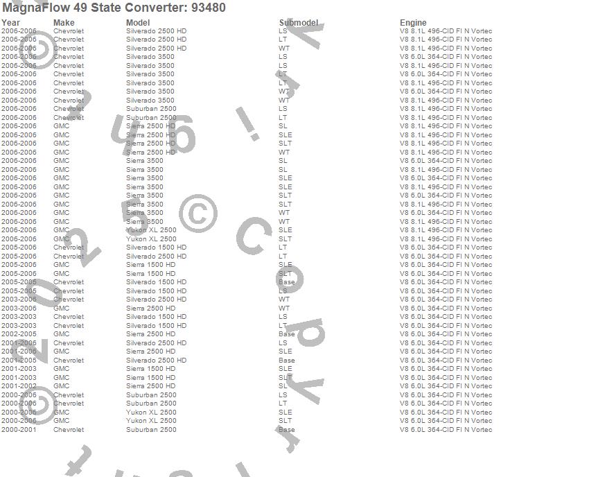 Below is an abreviated list of applications for the 93000 Series Direct Fit Catalytic Converter.