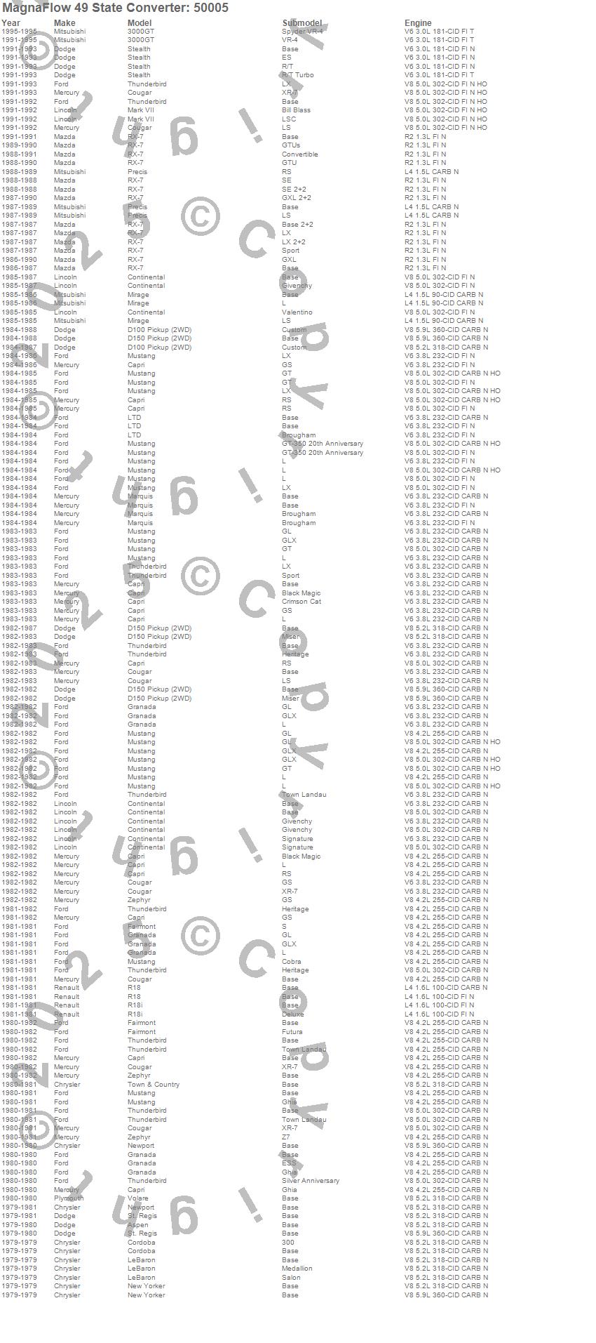 3000GT, Aspen, Capri, Colt, Continental, Cordoba, Cougar, D100 Pickup, D150 Pickup, Diplomat, Fairmont, Fifth Avenue, Gran Fury, Granada, Imperial, LeBaron, LTD, Marquis, Mirada, Mirage more…