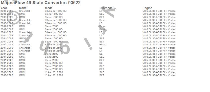 Below is an abreviated list of applications for the 93000 Series Direct Fit Catalytic Converter.