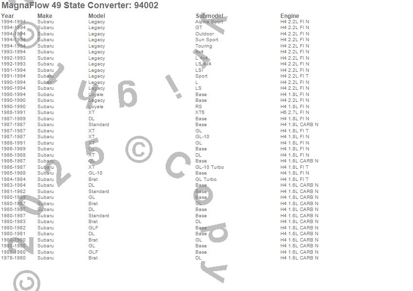 Below is an abreviated list of applications for the 94000 Series OBDII Compliant Universal Catalytic Converter.