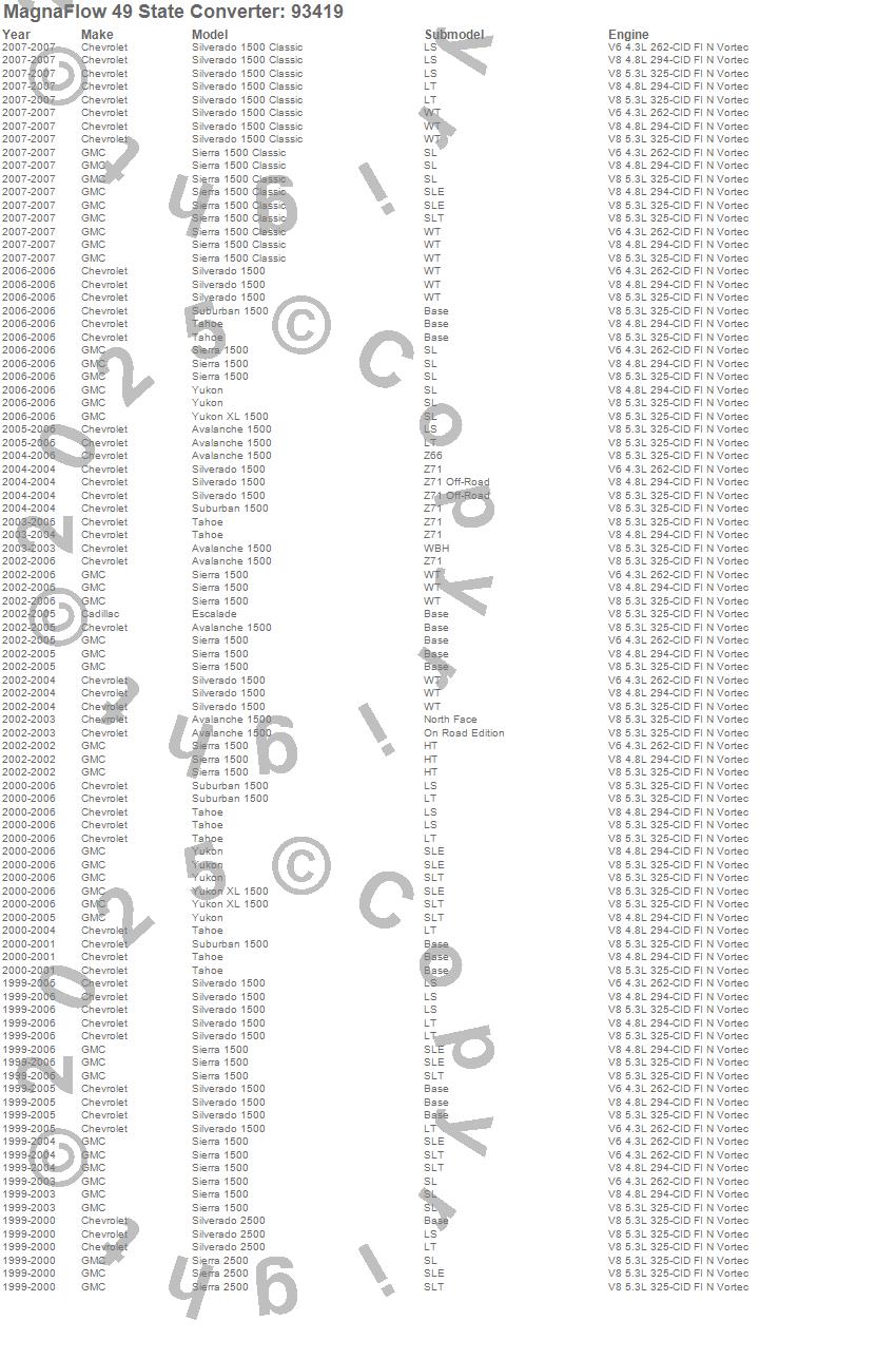 Below is an abreviated list of applications for the 93000 Series OBDII Compliant Direct Fit Catalytic Converter.