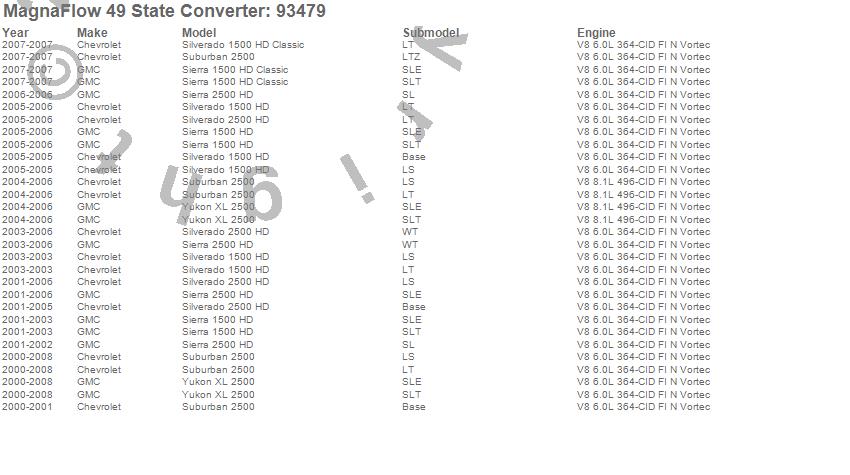 Below is an abreviated list of applications for the 93000 Series Direct Fit Catalytic Converter.
