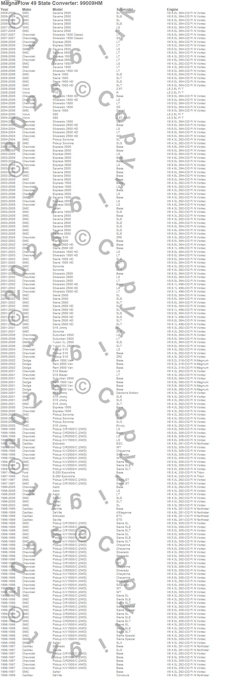 Below is an abreviated list of applications for the Heavy Metal Series Universal Catalytic Converter.