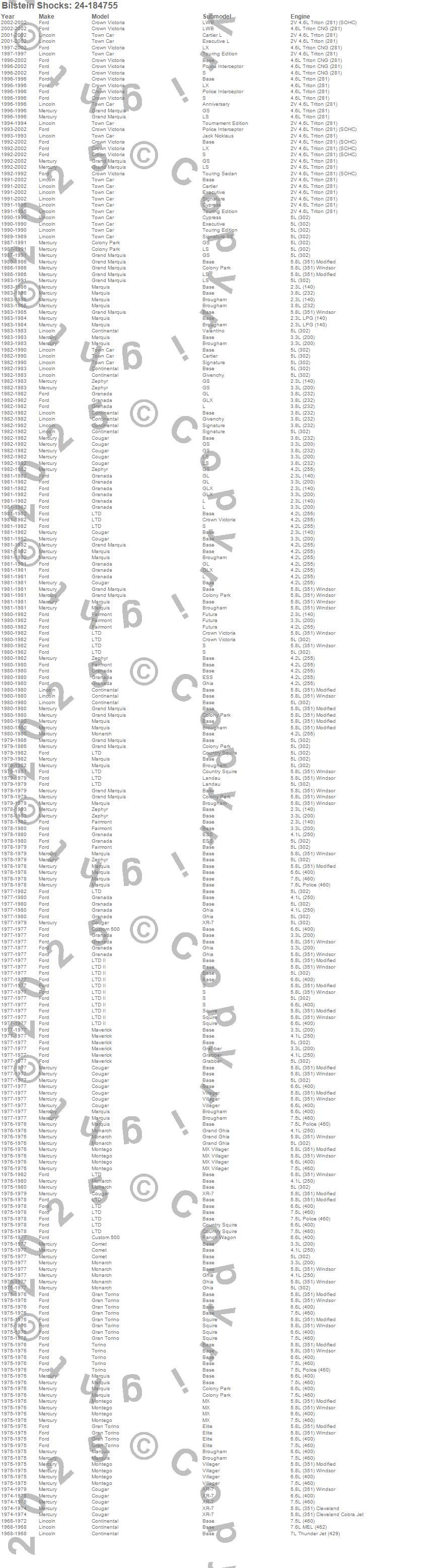 Colony Park, Comet, Continental, Cougar, Crown Victoria, Custom 500, Fairmont, Gran Torino, Granada, Grand Marquis, LTD, LTD Crown Victoria, LTD II, Marquis, Maverick, Monarch, Montego, Ranchero, Torino, Town Car more…