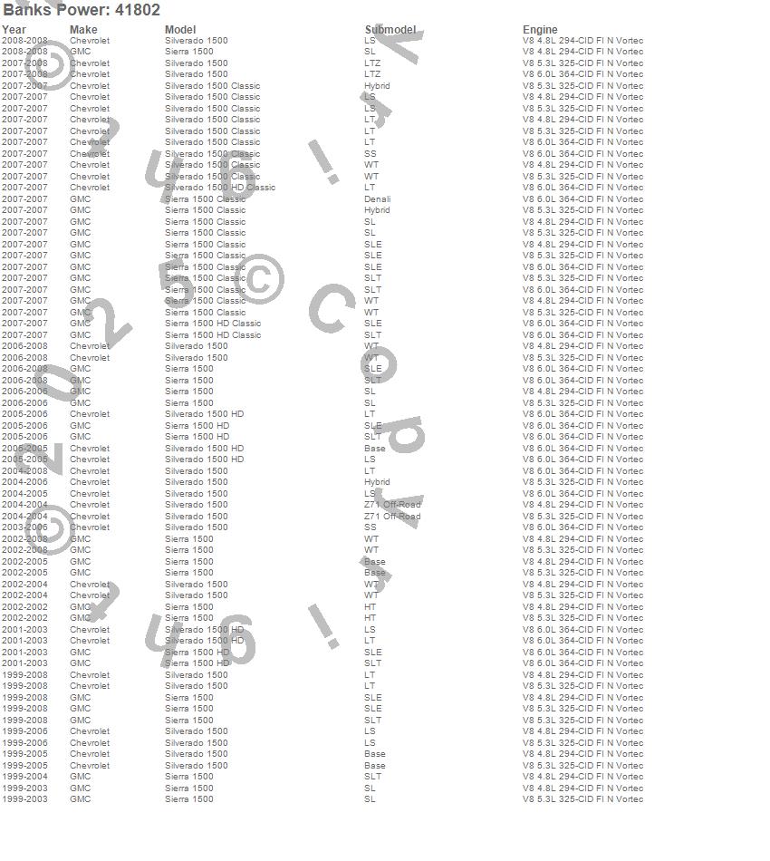 Below is an abreviated list of applications for the Banks Ram-Air Intake System.