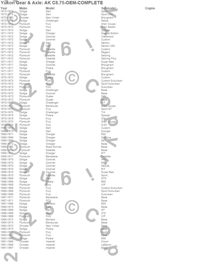 Barracuda, Belvedere, Challenger, Charger, Coronet, Dart, Duster, Fury, GTX, Imperial, ML350, Monaco, New Yorker, Polara, Road Runner, Satellite, Chrysler, Dodge, Mercedes-Benz, Plymouth more…