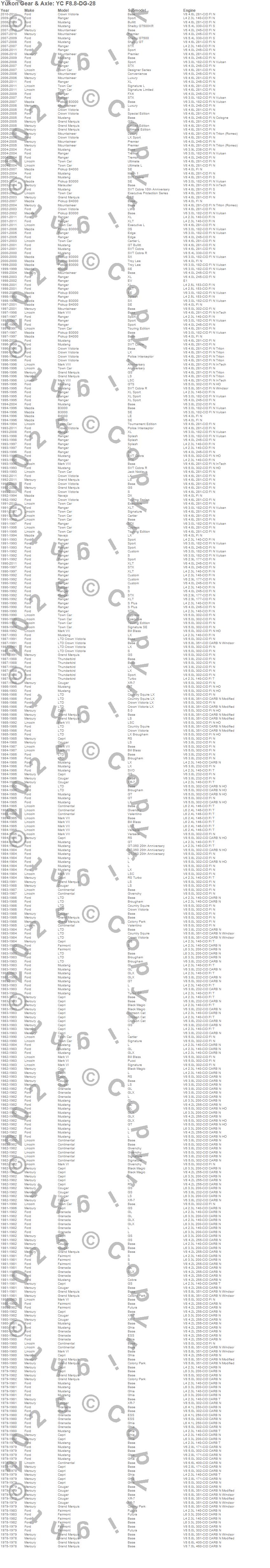 B3000, B4000, Bronco, Capri, Continental, Cougar, Crown Victoria, E-150 Econoline, E-150 Econoline Club Wagon, Granada, Grand Marquis, LTD, LTD Crown Victoria, Mark VI, Mountaineer, Mustang, Ranger, Thunderbird, Town Car, Ford more…