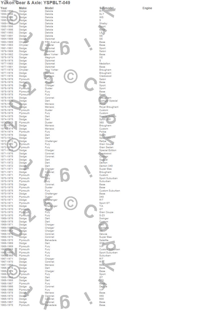Belvedere, Belvedere II, Challenger, Charger, Coronet, Dakota, Dart, Diplomat, Durango, Duster, Fifth Avenue, Fury, Fury I, Fury II, Fury III, Gran Fury, Imperial, Magnum, Monaco, New Yorker more…