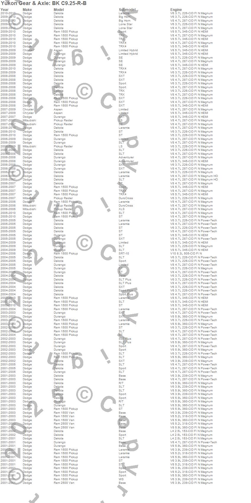 Below is an abreviated list of applications for the Differential Bearing Kit.