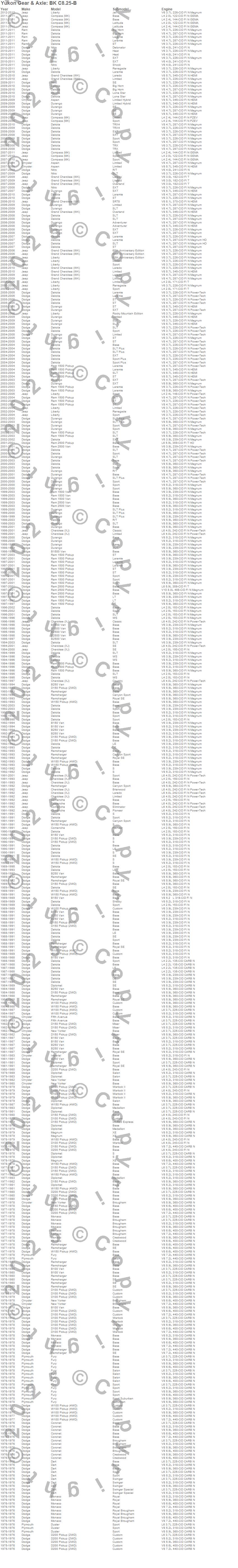 Cherokee (XJ), Coronet, D150 Pickup, Dakota, Dart, Duster, Fifth Avenue, Fury, Liberty, Magnum, New Yorker, Ram 1500 Van, Ram 2500 Van, Ramcharger, W150 Pickup, Chrysler, Dodge, Jeep, Plymouth, Ram more…