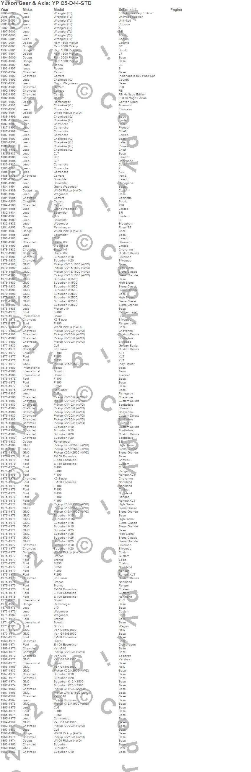 Blazer, Blazer K5, Bronco, C10 Pickup, C15/C1500, C15/C1500 Suburban, C25/C2500 Suburban, Camaro, Cherokee (XJ), CJ5, CJ5A, CJ6, CJ6A, CJ7, Comanche, Commando, E-100 Econoline, E-100 Econoline Club Wagon, E-150 Econoline, E-150 Econoline Club Wagon more…