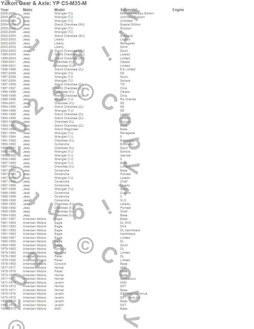 AMX, Cherokee (XJ), Comanche, Concord, Grand Cherokee (WJ), Grand Cherokee (ZJ), Grand Wagoneer, Hornet, Javelin, Liberty, Pacer, Wrangler (JK), Wrangler (TJ), Wrangler (YJ), American Motors, Jeep, 2011, 2010, 2009, 2008 more…