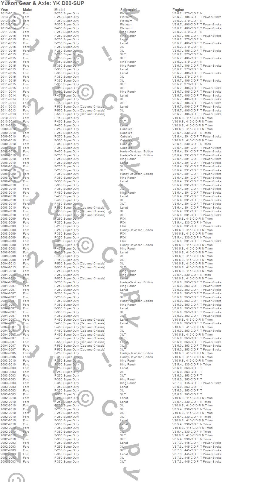 Below is an abreviated list of applications for the Yukon Differential Master Overhaul Kit.