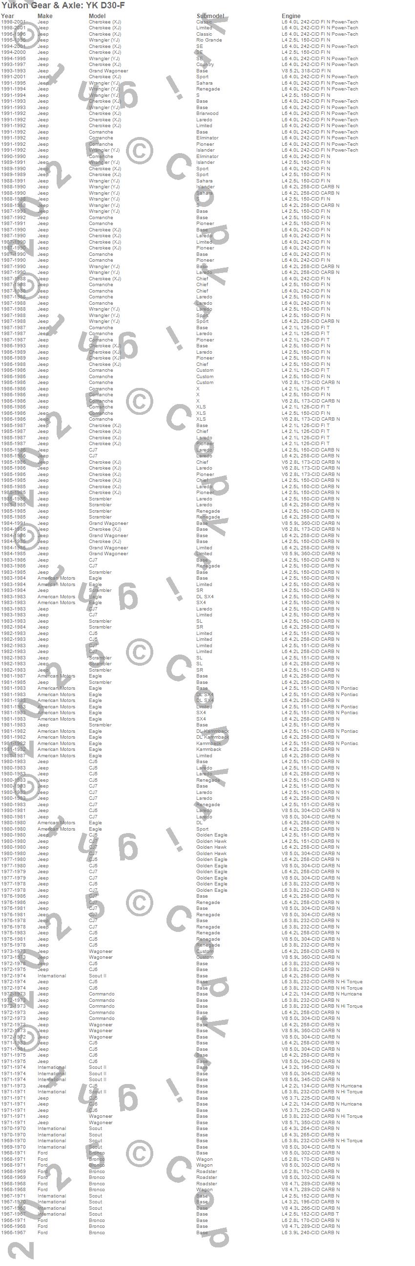 Below is an abreviated list of applications for the Yukon Differential Master Overhaul Kit.