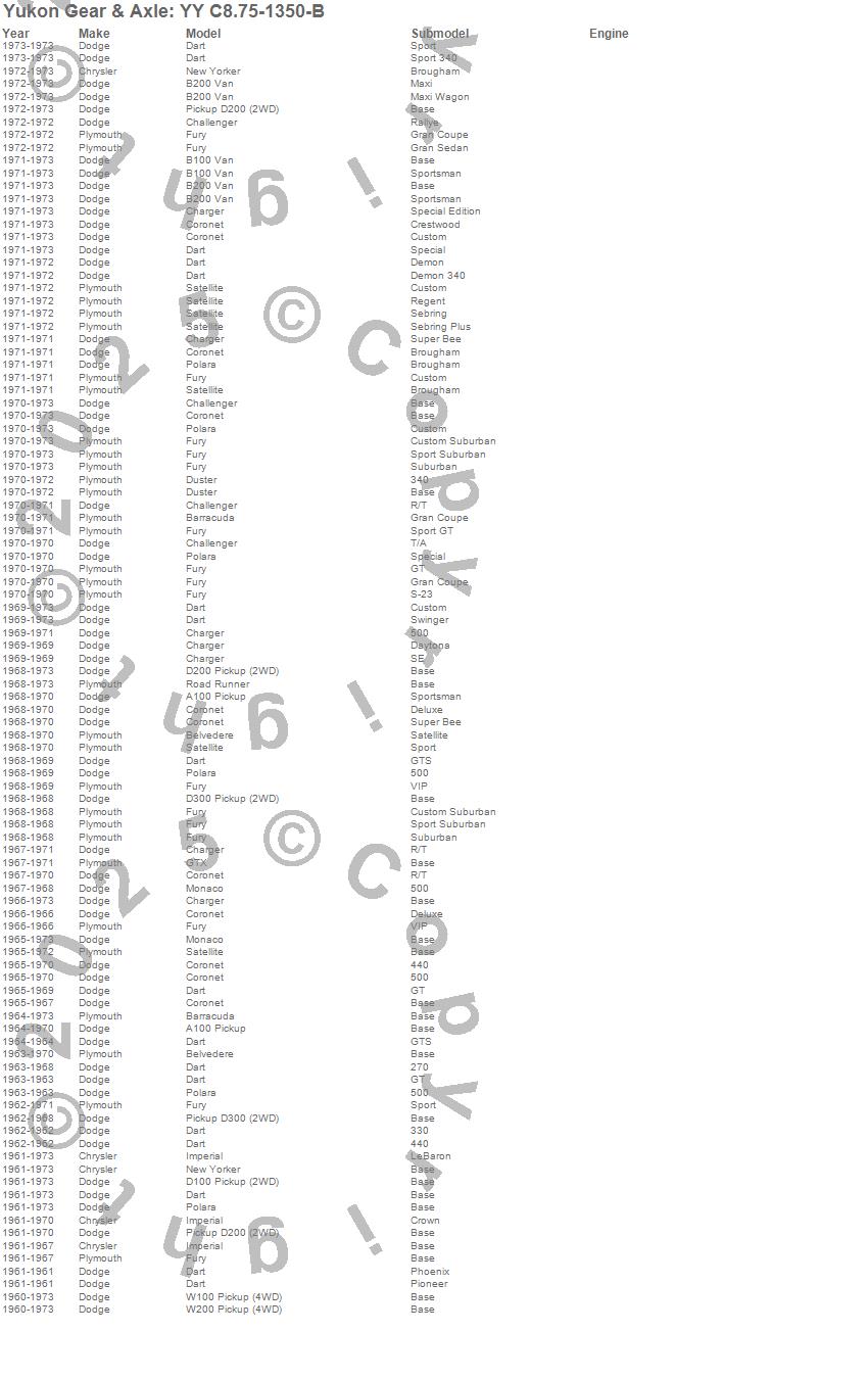Barracuda, Belvedere, Belvedere II, Challenger, Charger, Coronet, Dart, Duster, Fury, GTX, Imperial, ML350, Monaco, New Yorker, Polara, Road Runner, Satellite, Chrysler, Dodge, Mercedes-Benz more...