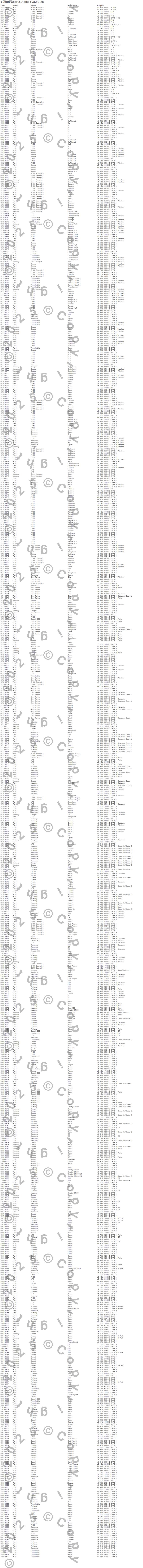 Bronco, E-100 Econoline, E-100 Econoline Club Wagon, E-150 Econoline, E-150 Econoline Club Wagon, E-200 Econoline, Econoline Cargo, F-100, F-150, Fairlane, Falcon, Galaxie, Galaxie 500, Gran Torino, Granada, LTD, LTD II, Maverick, Mustang, Ranchero more…