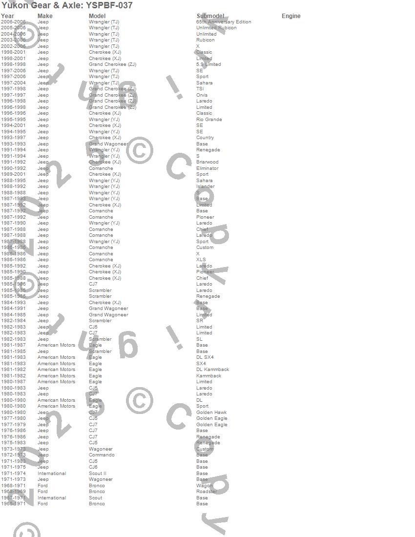 Bronco, Cherokee (XJ), CJ5, CJ6, CJ7, Comanche, Commando, Eagle, Grand Cherokee (ZJ), Scout, Scout II, Scrambler, Wagoneer, Wrangler (LJ), Wrangler (TJ), American Motors, Ford, International, Jeep, 2006 more…