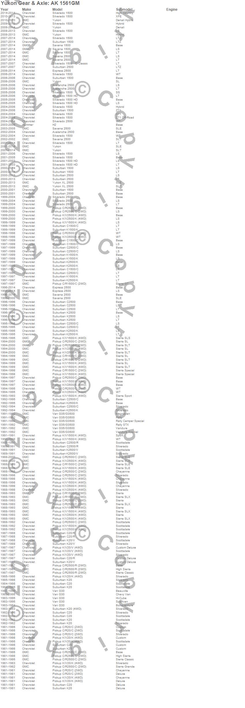 Avalanche, Avalanche 1500, Avalanche 2500, C1500 Pickup, C1500 Suburban, C2500 Pickup, C2500 Suburban, Express 2500, H2, K1500 Pickup, K1500 Suburban, K2500 Pickup, K2500 Suburban, K2500 Suburban (Canadian), R2500 Pickup, R2500 Suburban, Savana 2500, Sierra 1500, Sierra 1500 HD, Sierra 1500 HD Classic more…