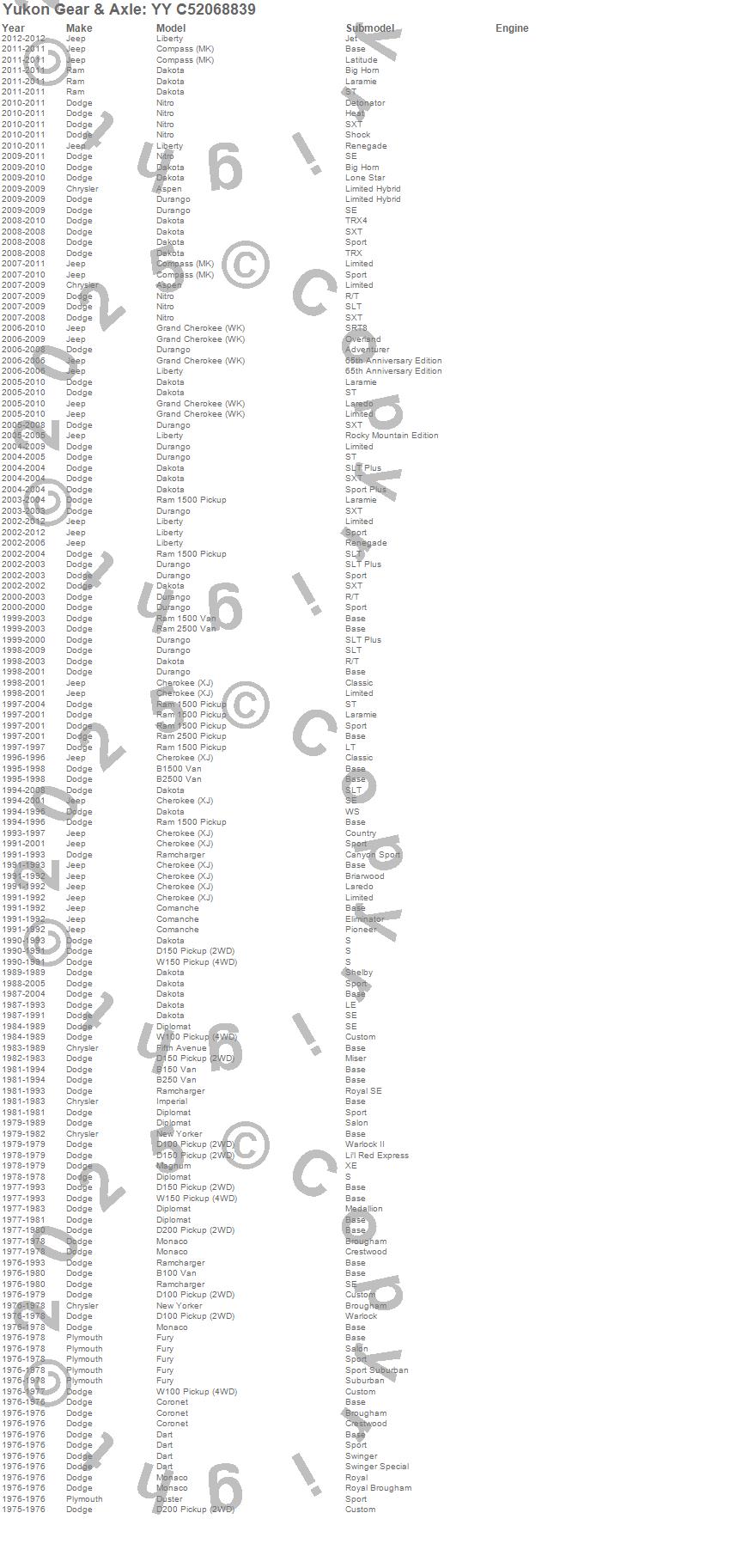 Aspen, B100 Van, B150 Van, B1500 Van, B250 Van, B2500 Van, Cherokee (XJ), Comanche, Commander, Compass, Coronet, D100 Pickup, D150 Pickup, D200 Pickup, Dakota, Dart, Diplomat, Durango, Duster, Fifth Avenue more...