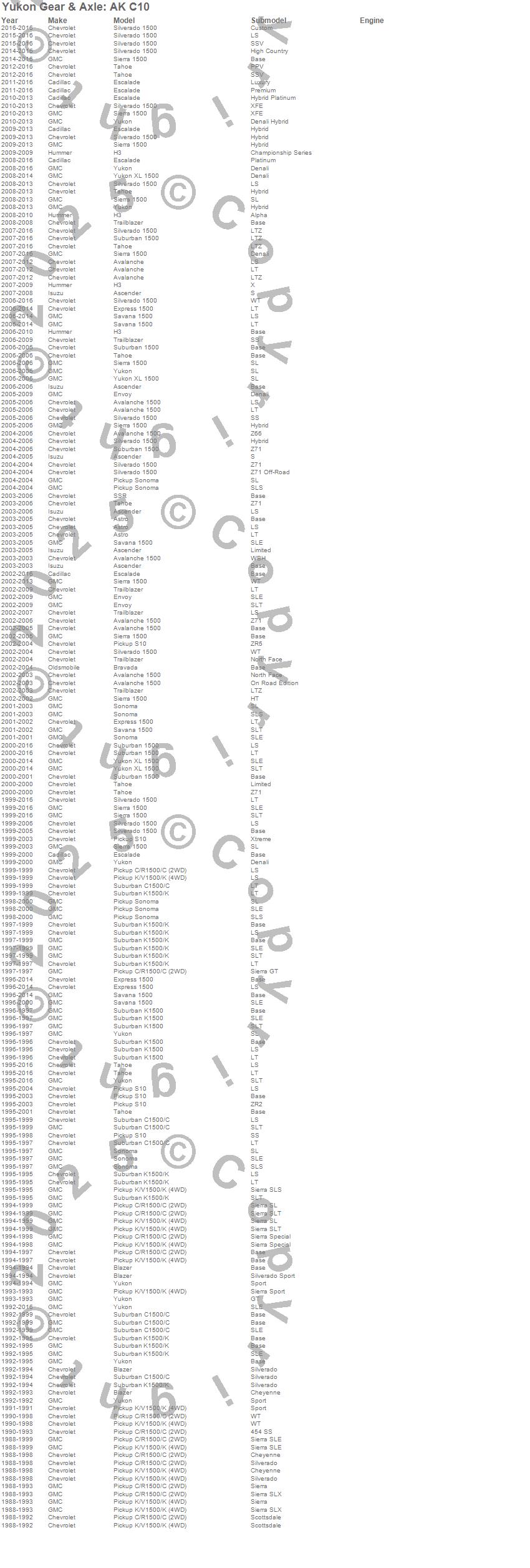 Avalanche, C1500 Suburban, Envoy, Envoy XL, Envoy XUV, Escalade, Escalade ESV, Escalade EXT, Express 1500, K1500 Suburban, Savana 1500, Sierra 1500, Silverado 1500, Sonoma, Suburban 1500, Tahoe, Trailblazer, Yukon, Yukon XL 1500, Cadillac more…