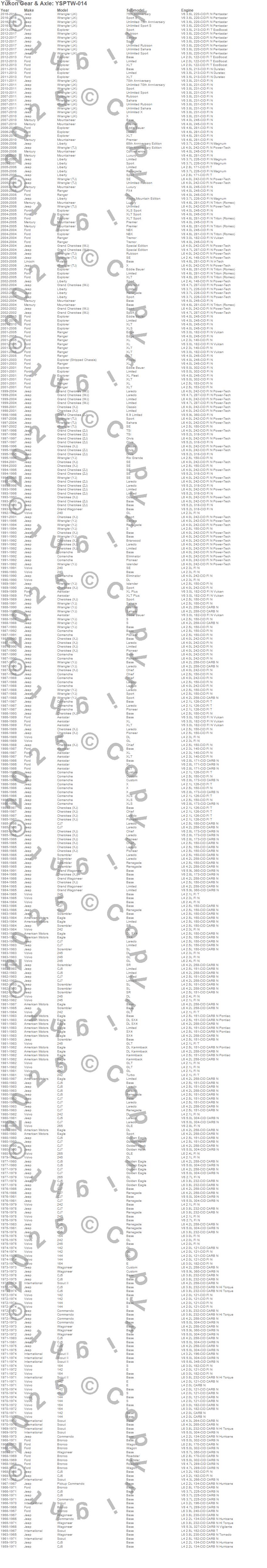 142, 144, 164, 240, 242, 245, 265, Aerostar, Aviator, Bronco, Cherokee (XJ), CJ5, CJ5A, CJ6, CJ6A, CJ7, Comanche, Commando, Eagle, Explorer more…