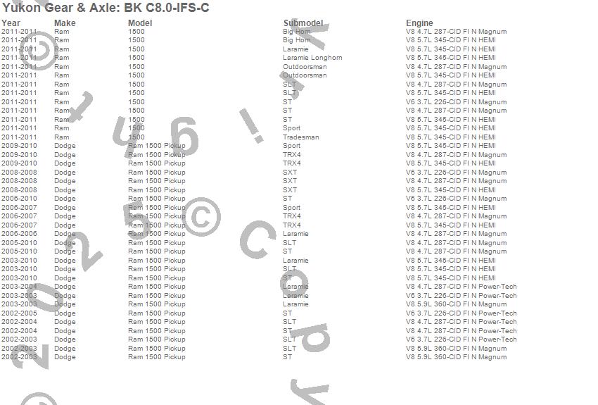 Below is an abreviated list of applications for the Differential Bearing Kit.