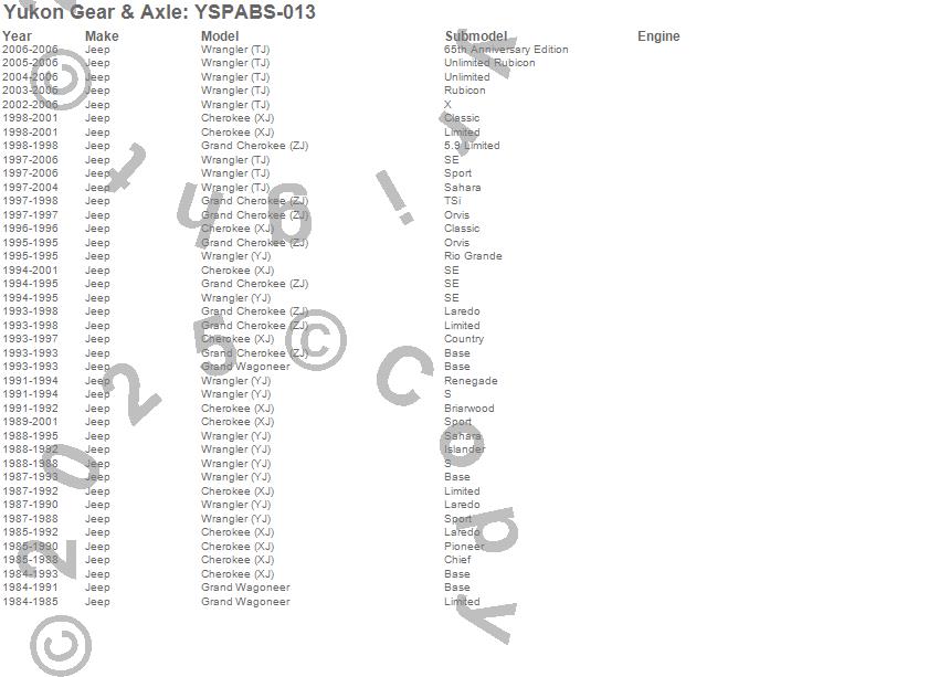 Cherokee (XJ), Comanche, Grand Cherokee (ZJ), Grand Wagoneer, Wrangler (TJ), Wrangler (YJ), Jeep, 2006, 2005, 2004, 2003, 2002, 2001, 2000, 1999, 1998, 1997, 1996, 1995, 1994 more...