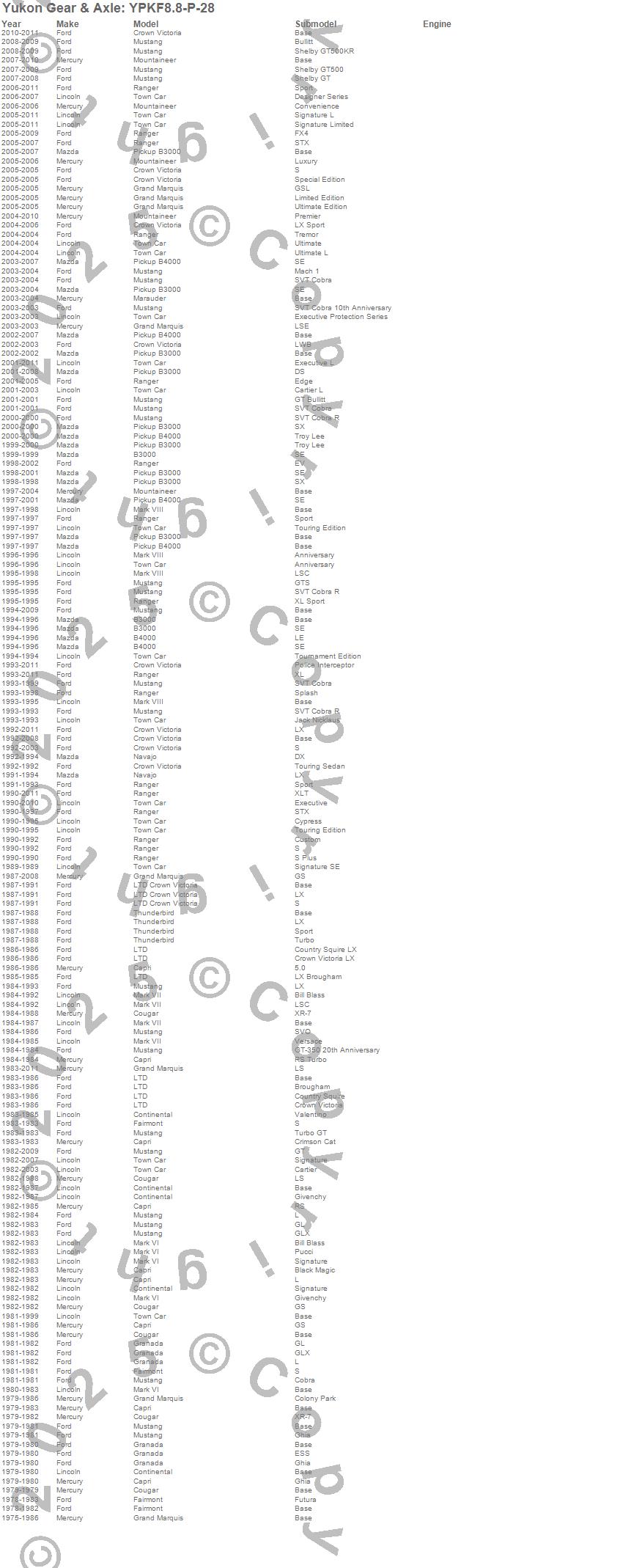 B3000, B4000, Capri, Continental, Cougar, Crown Victoria, Fairmont, Granada, Grand Marquis, LTD, LTD Crown Victoria, Marauder, Mark VI, Mark VII, Mountaineer, Mustang, Ranger, Ranger (Brazil), Thunderbird, Town Car more…